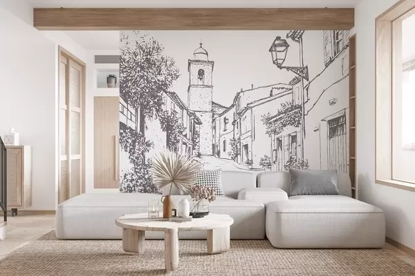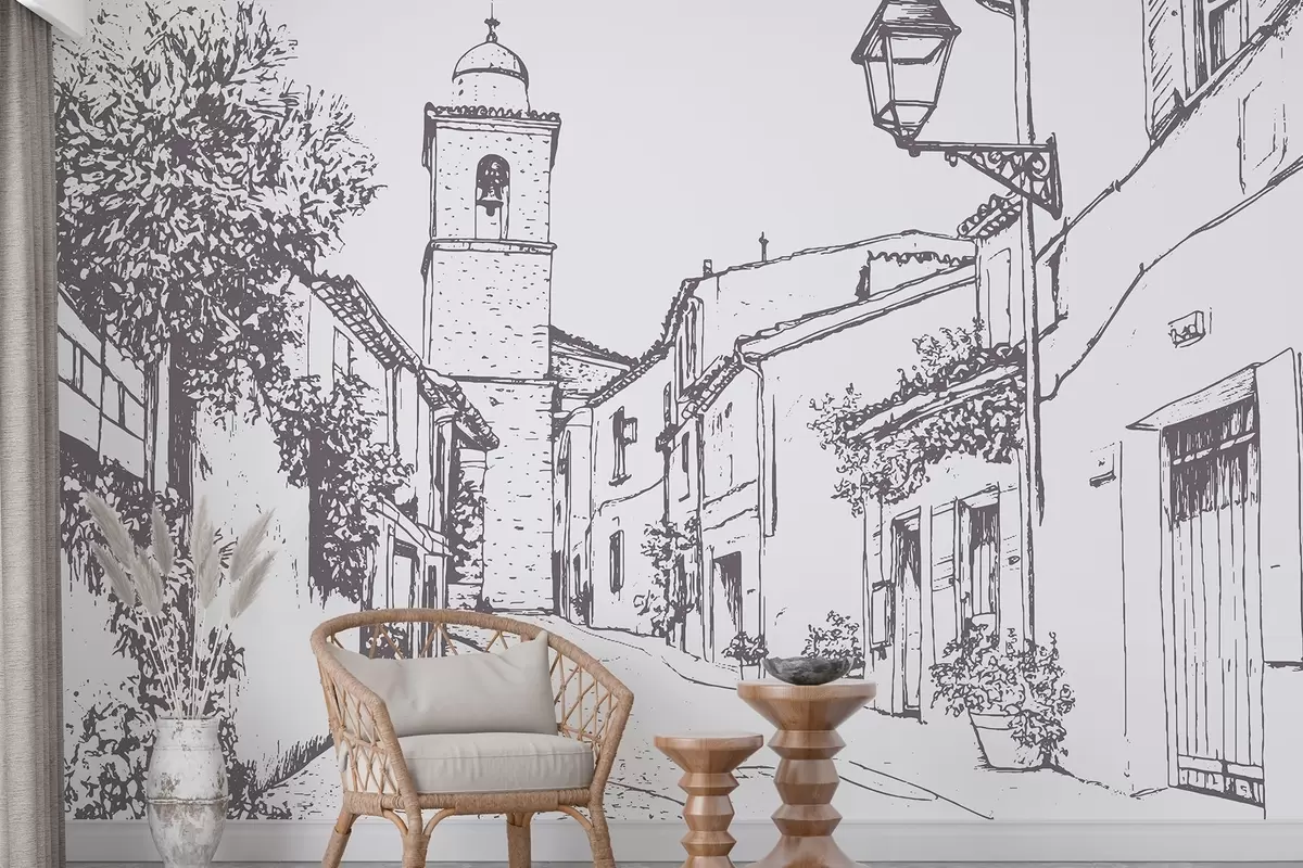 Fotomurales Calle de la ciudad, hermosa arquitectura, edificios, Mediterráneo, dibujo lineal, color beige Nr. w03345v1