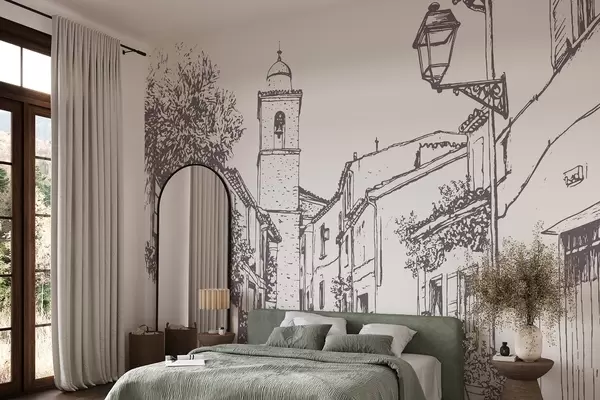 Fotomurales Calle de la ciudad, hermosa arquitectura, edificios, Mediterráneo, dibujo lineal, color beige Nr. w03345v1