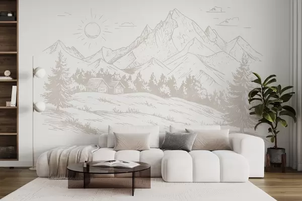 Fotomurales Dibujo de montañas, paisajes naturales, bosque, casas de madera, color beige Nr. w03348