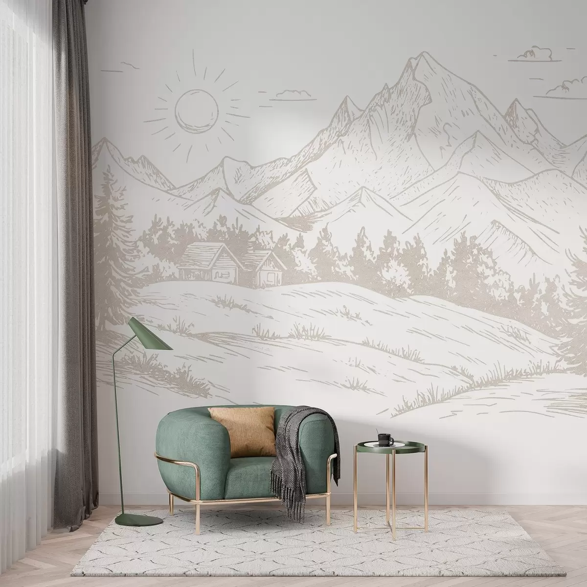 Fotomurales Dibujo de montañas, paisajes naturales, bosque, casas de madera, color beige Nr. w03348