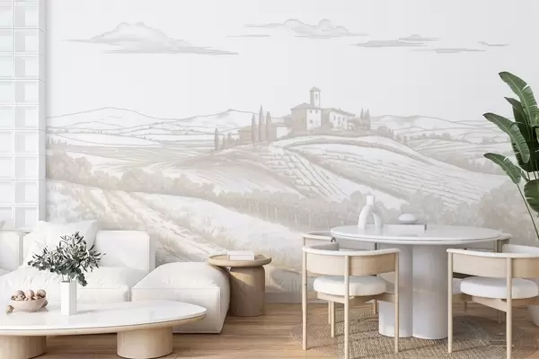 Fotomurales Paisajes de la Toscana, Italia, viñedos, naturaleza, castillo antiguo, colores beige Nr. w03349