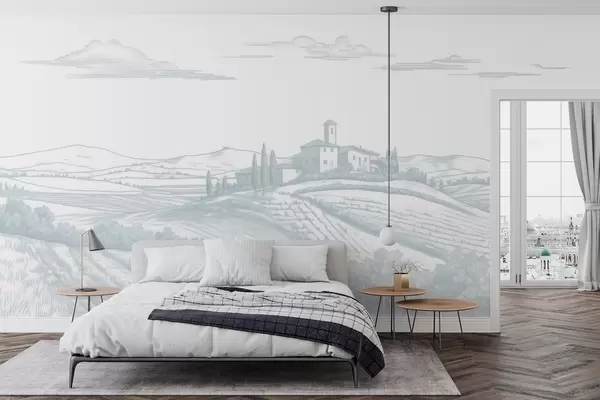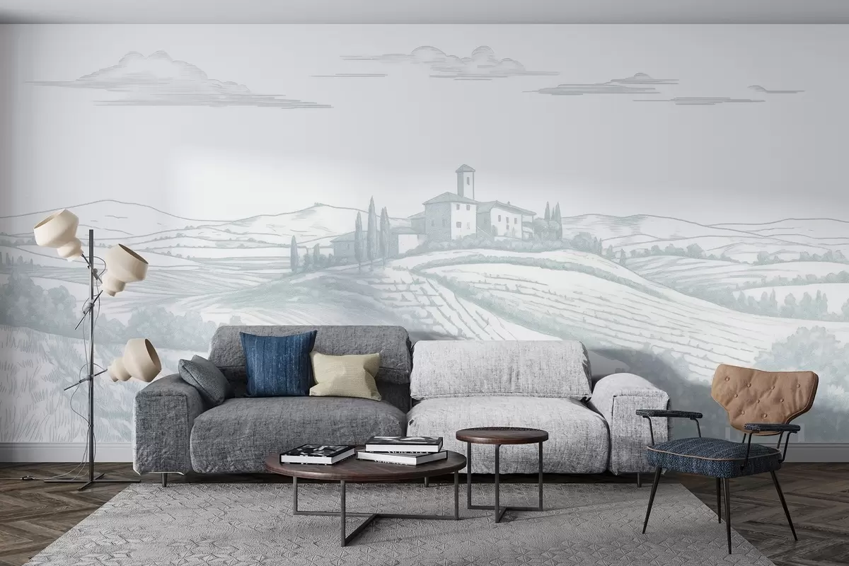 Fotomurales Paisajes de la Toscana, Italia, viñedos, naturaleza, castillo antiguo, colores azules Nr. w03349v1