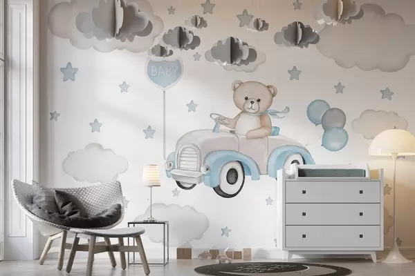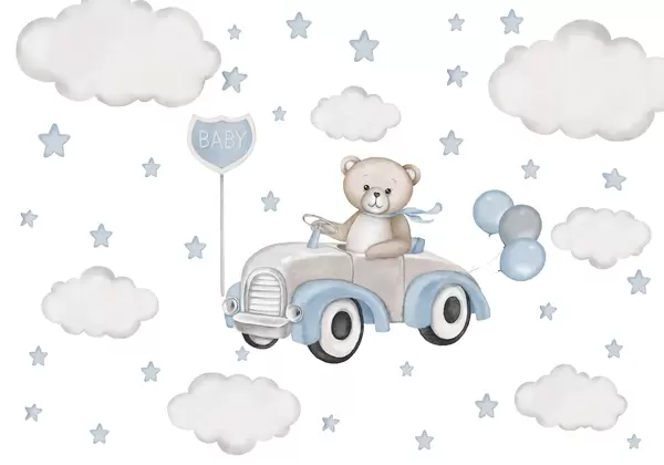 Fotomurales Adorable ilustración de un osito de peluche conduciendo un coche de época entre nubes y estrellas Nr. w03382v1