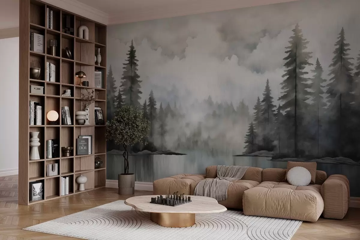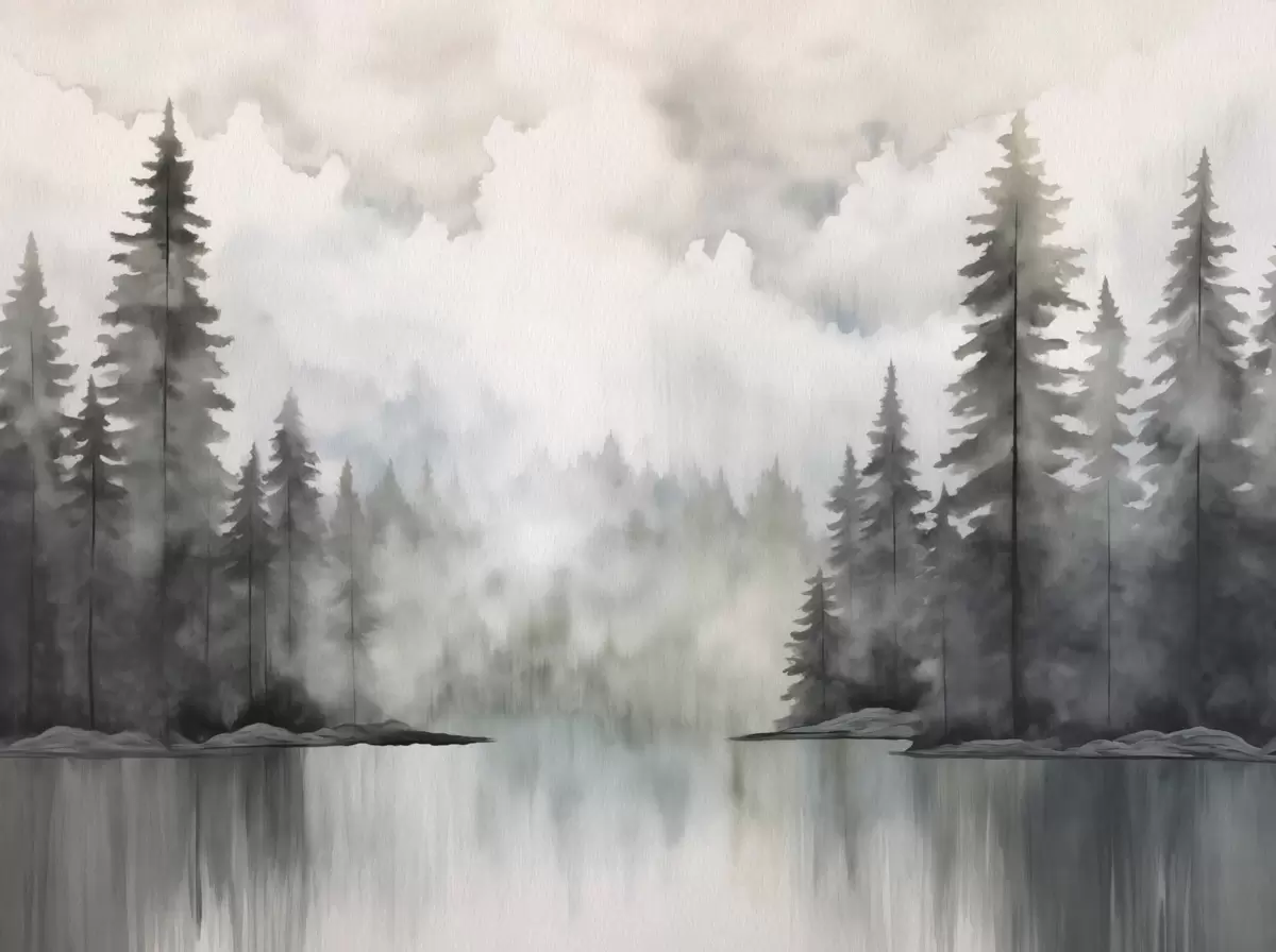 Fotomurales Bosque, lago y cielo nublado en estilo acuarela Nr. w03387