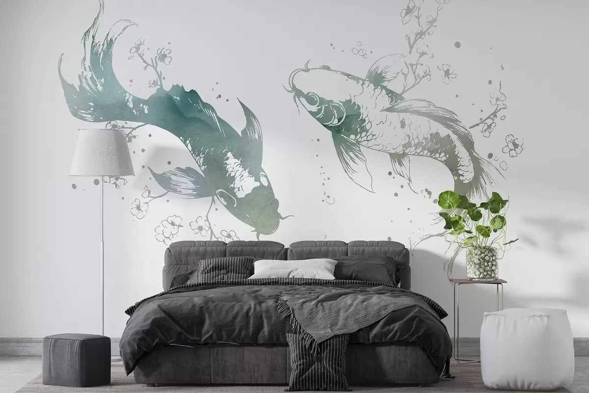 Fotomurales Acuarela pez, estilo oriental, cerezo, colores verdes Nr. w03447v2