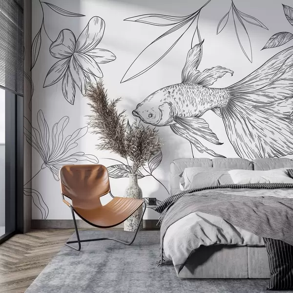 Fotomurales Dibujo lineal pez con flores, minimalismo, marino, floral, estilo tinta Nr. w03516