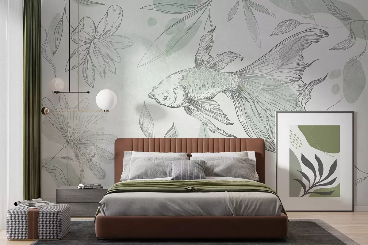 Fotomurales Pez con elementos florales, fondo verde, dibujo lineal Nr. w03517v1