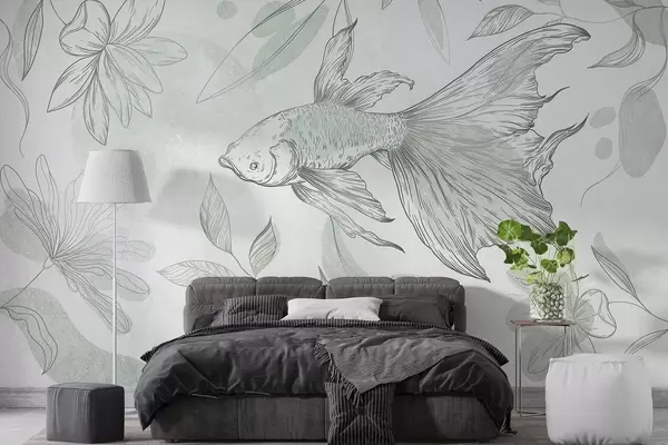 Fotomurales Pez con elementos florales, fondo verde, dibujo lineal Nr. w03517v1