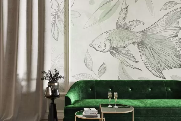 Fotomurales Pez con elementos florales, fondo verde, dibujo lineal Nr. w03517v1