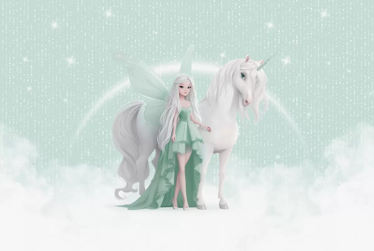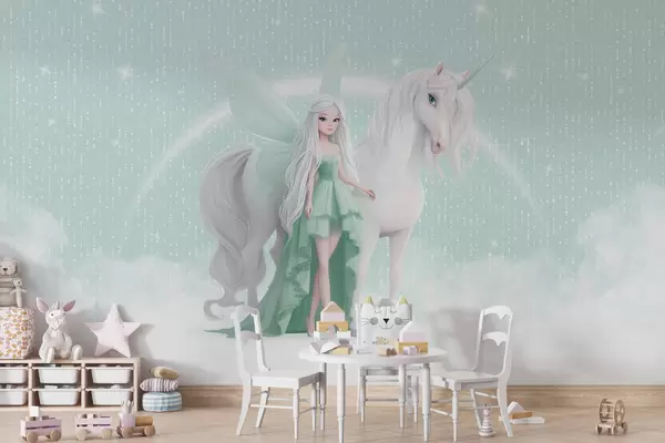 Fotomurales Un hada con un unicornio entre las nubes Nr. w03527v2