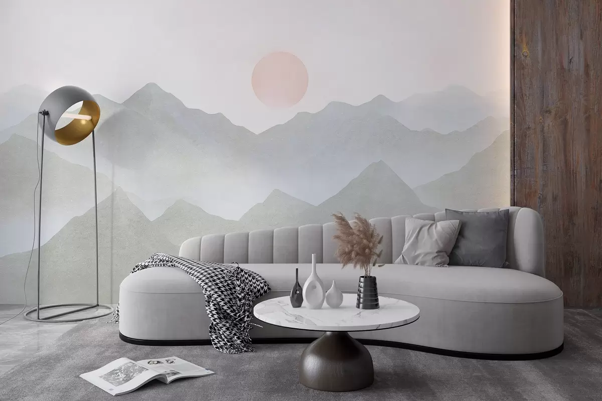 Fotomurales Paisaje de montaña estilo boho, puesta de sol, pastel suave, gris Nr. w03547v1