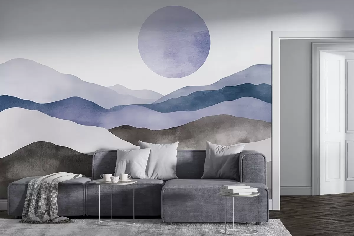 Fotomurales Acuarela montañas con el sol, estilo boho, púrpura, azul, gris Nr. w03551v1