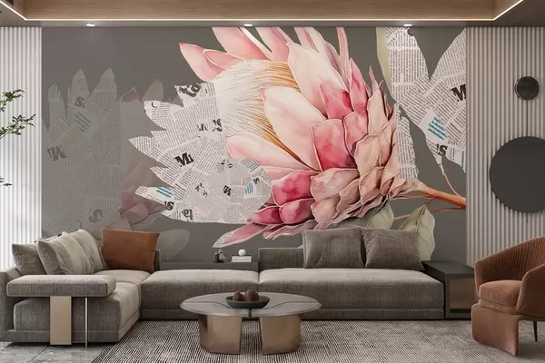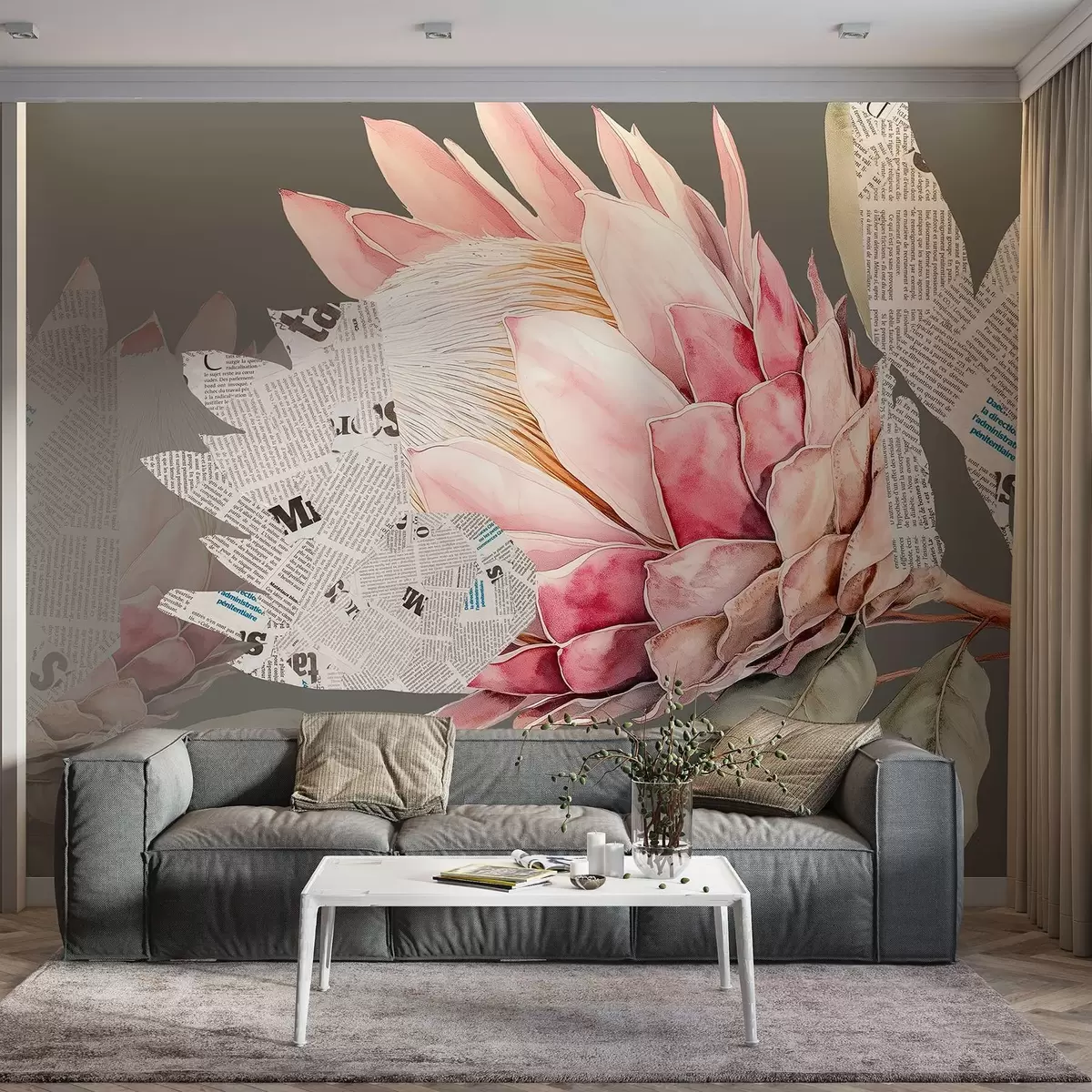murales de pared Flores de Protea, arte del periódico, floral, tropical, fondo verde w03667v1