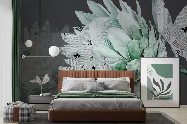 Fotomurales Flores de protea, arte periodístico, floral, tropical, fondo oscuro, colores verdes Nr. w03667v3