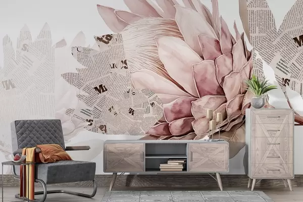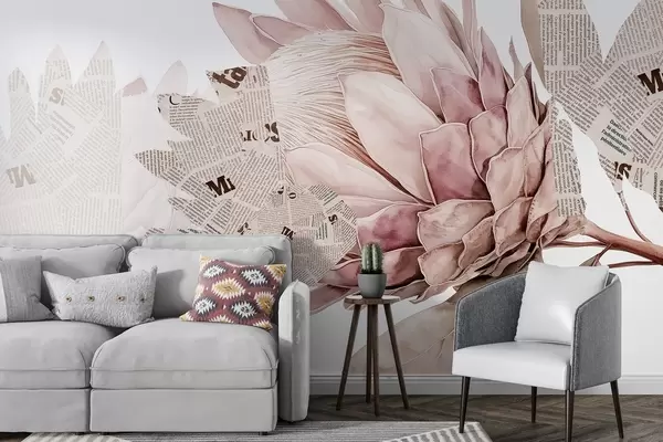 Fotomurales Flores de protea, arte periodístico, floral, tropical, colores beige pastel Nr. w03667v4