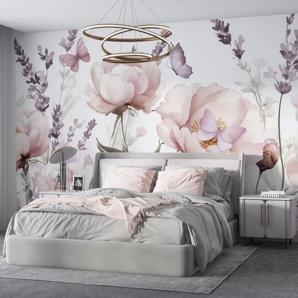 Fotomurales Pradera de flores, peonías, lavanda, mariposas, estilo acuarela, colores rosados Nr. w03668