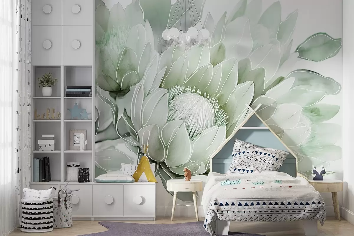 murales de pared Hermosas flores de protea, dibujo lineal, tropical, colores verdes w03669v2