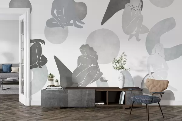 murales de pared Abstracciones geométricas con siluetas femeninas, estilo boho, colores grises w03753v5