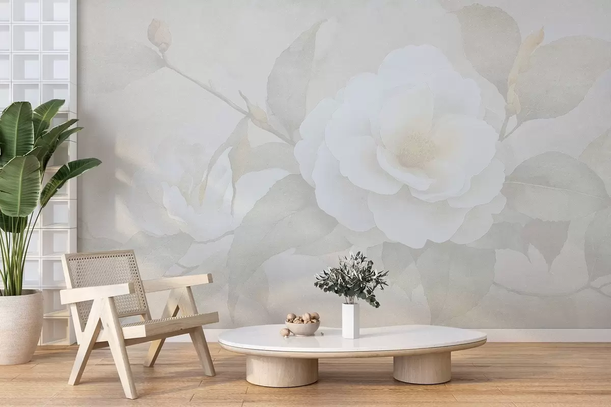 Fotomurales Pastel suave con flores de camelia en la rama, colores beige Nr. w03760