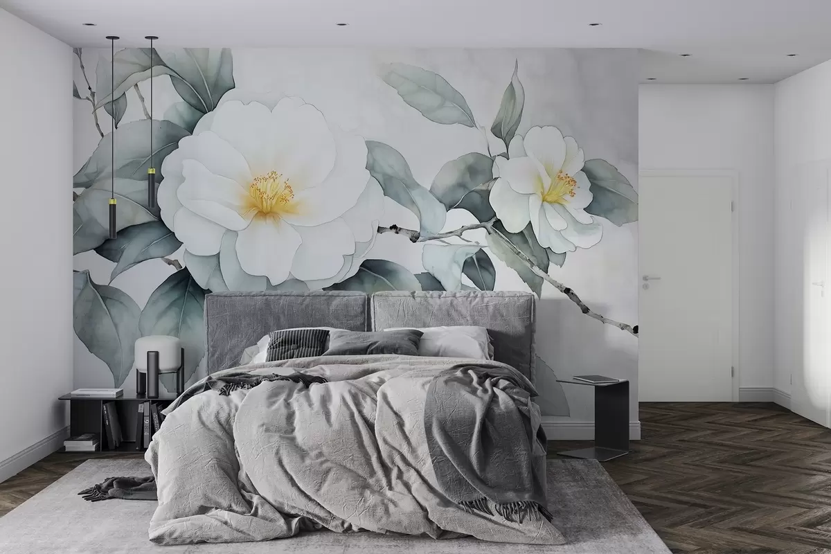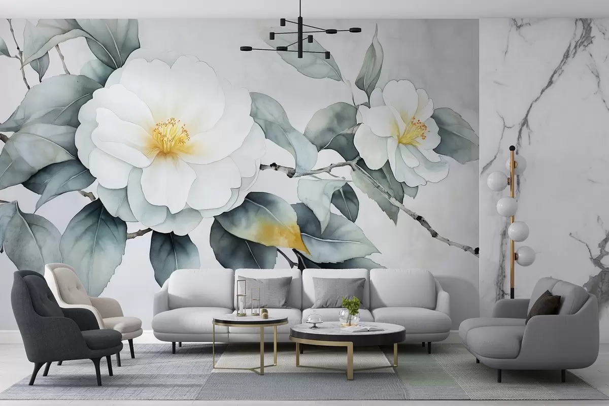 Fotomurales Flores de camelia estilo acuarela en la rama, colores naturales Nr. w03761