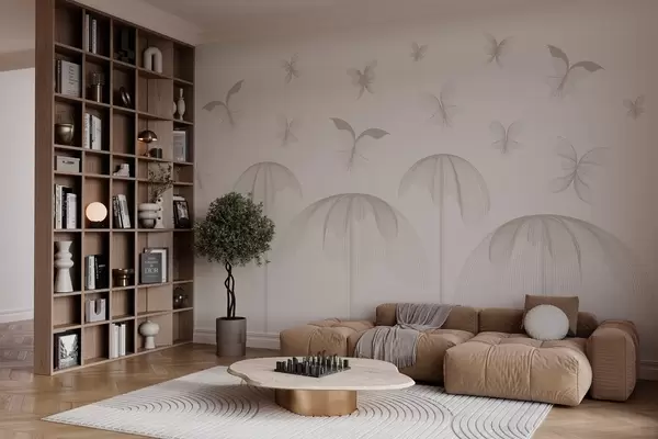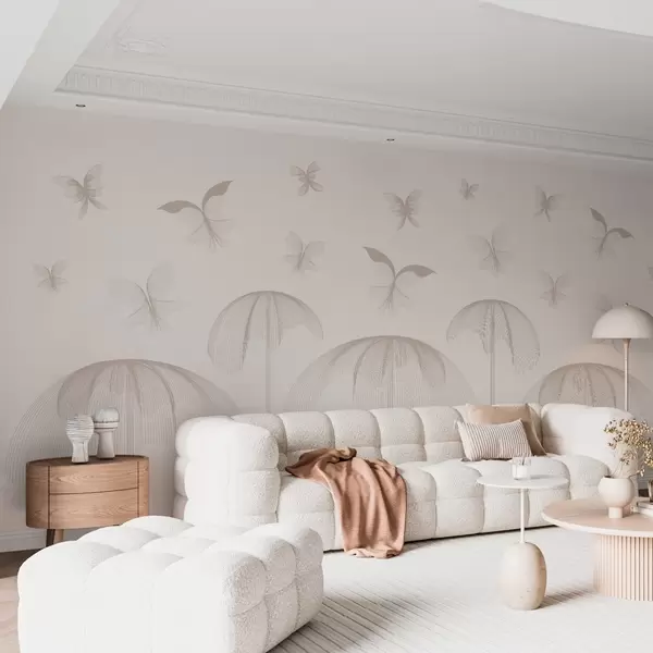 Fotomurales papel pintado minimalista lineal mariposas y fuentes sobre fondo lechoso Nr. w03762