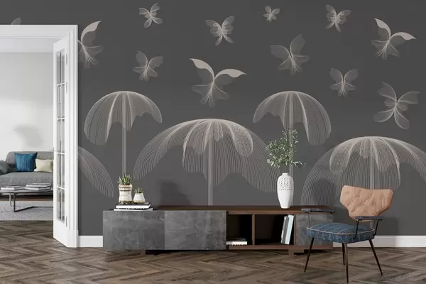 Fotomurales papel pintado minimalista lineal mariposas y fuentes sobre fondo gris oscuro Nr. w03762v1