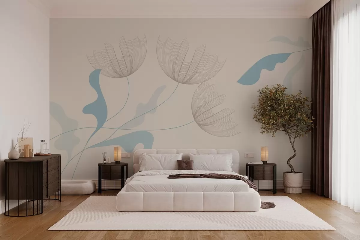 Fotomurales elegantes flores minimalistas en tonos azul claro sobre fondo beige Nr. w03763v1