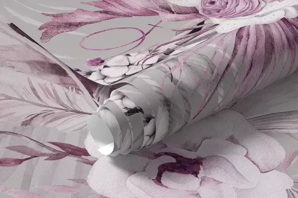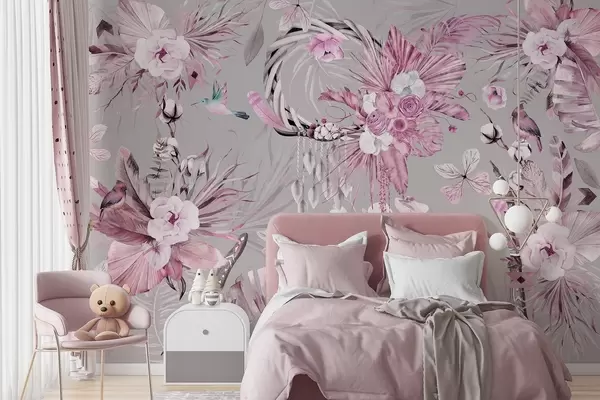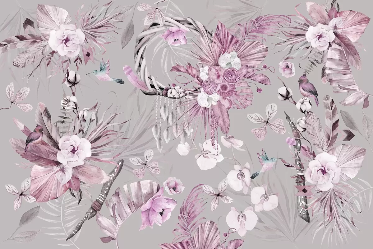 Fotomurales Adorno de estilo boho con flores de peonía y pájaros, estilo acuarela, colores rosas Nr. w03885v1