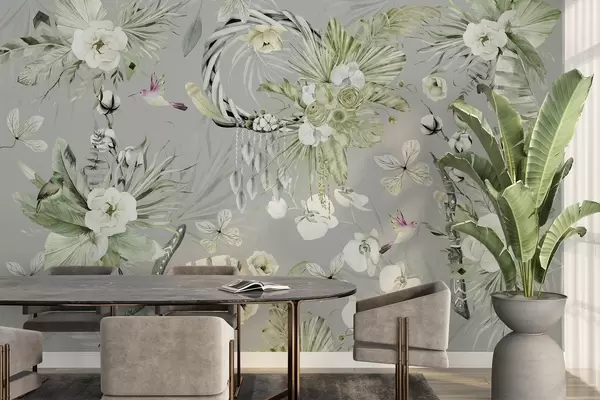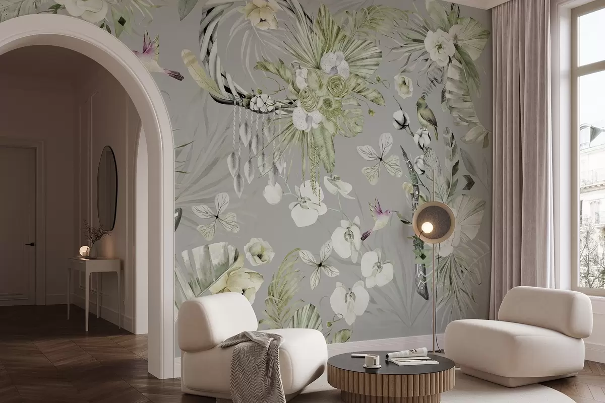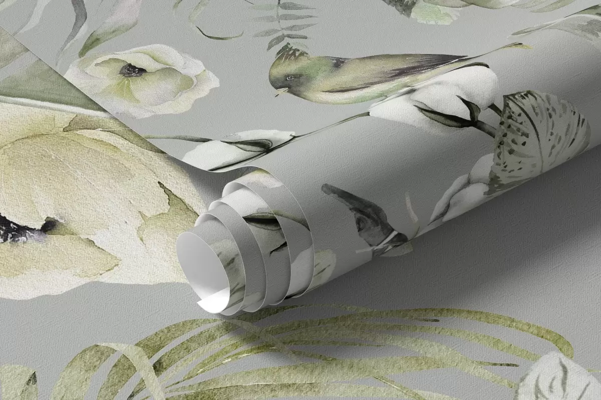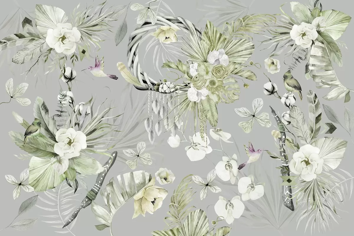 Fotomurales Adorno de estilo boho con flores de peonía y pájaros, estilo acuarela, colores verdes Nr. w03885v2