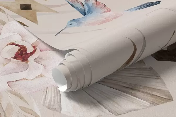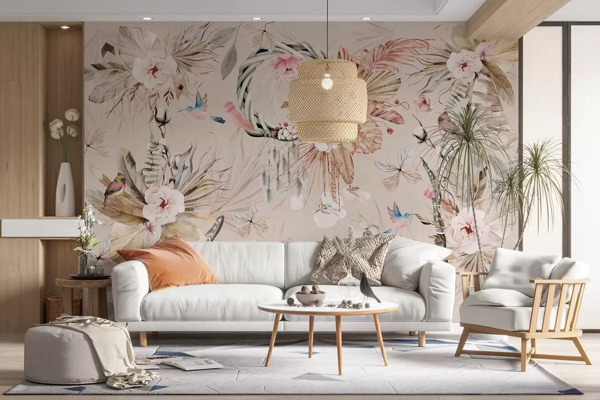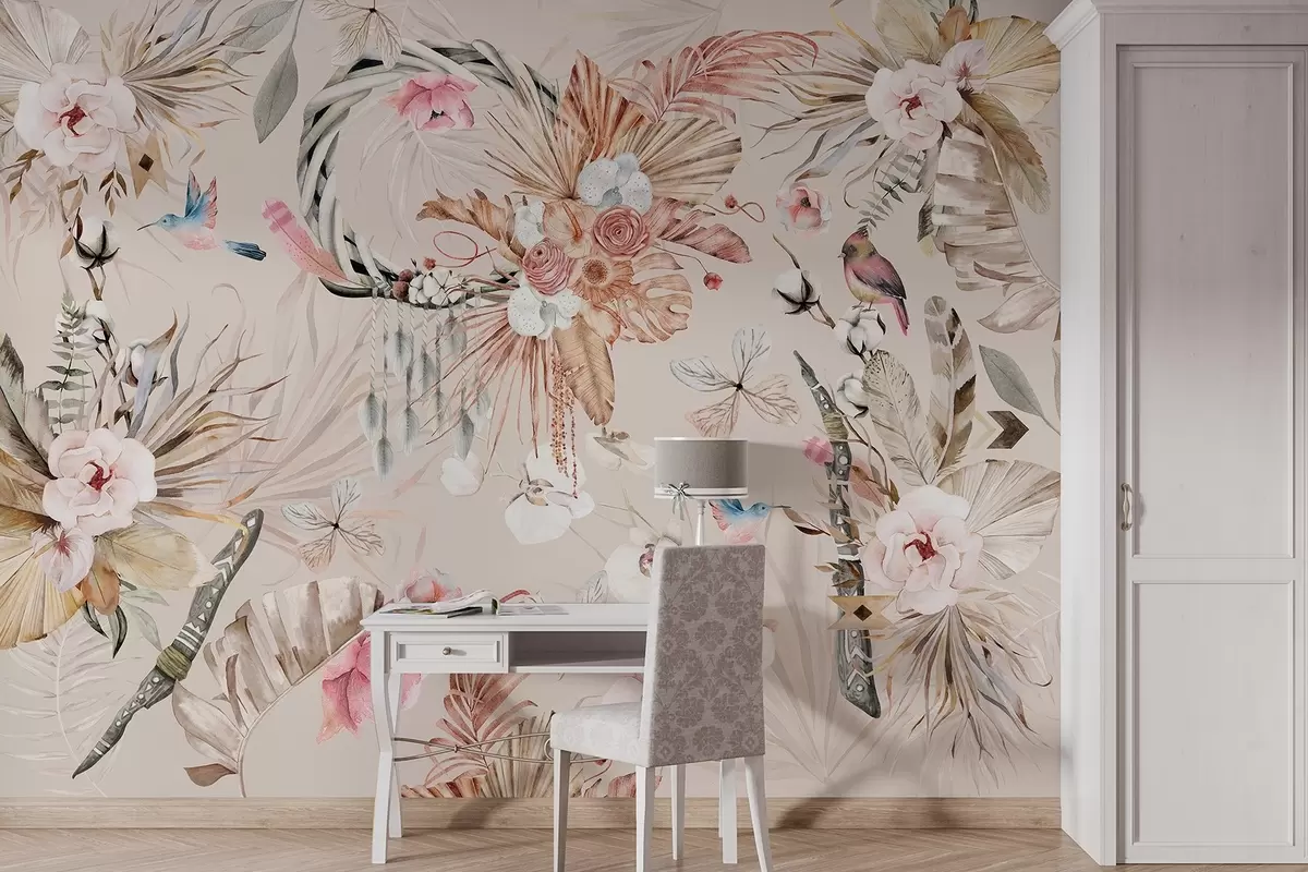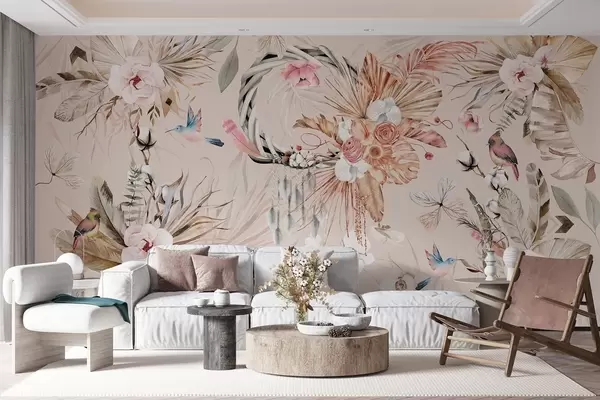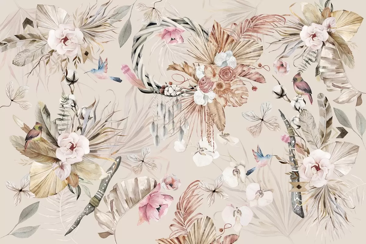 Fotomurales Adorno de estilo boho con flores de peonía y pájaros, estilo acuarela, colores suaves Nr. w03885v3
