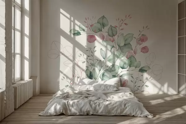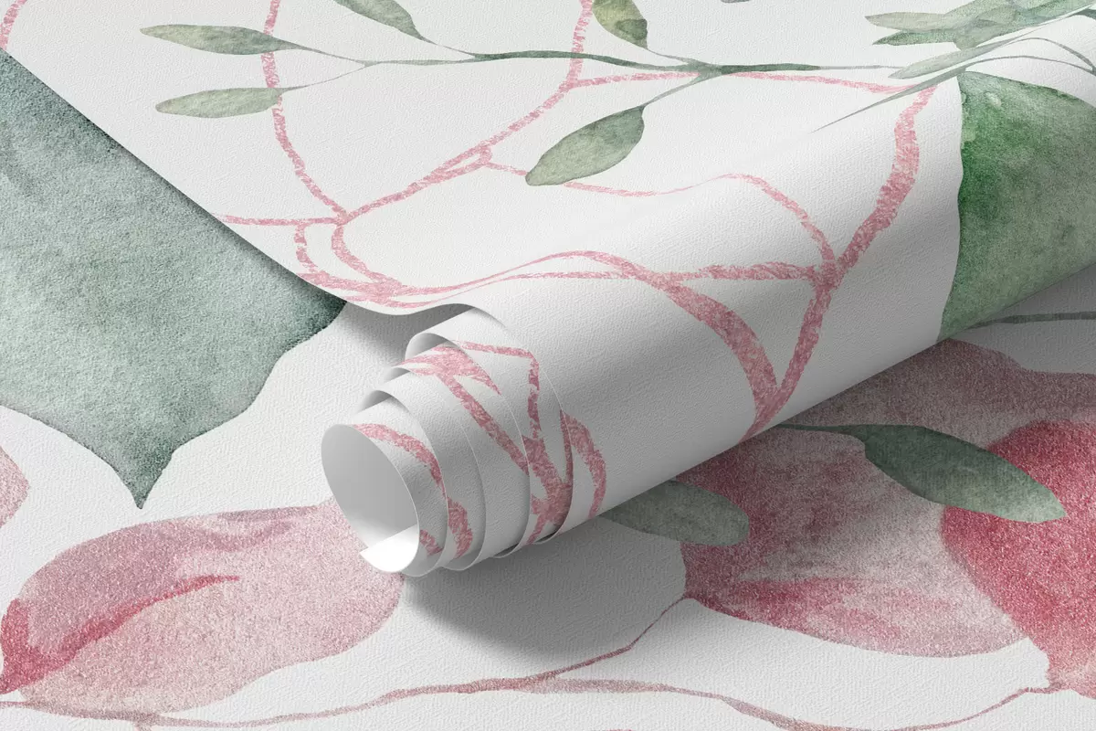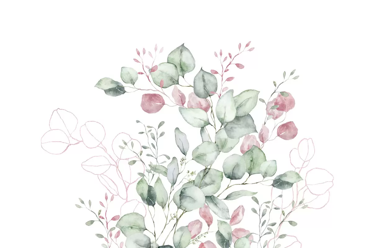 Fotomurales Vegetación y ramas imitación de acuarela texturizada, tonos verdes y rosas Nr. w03927v2