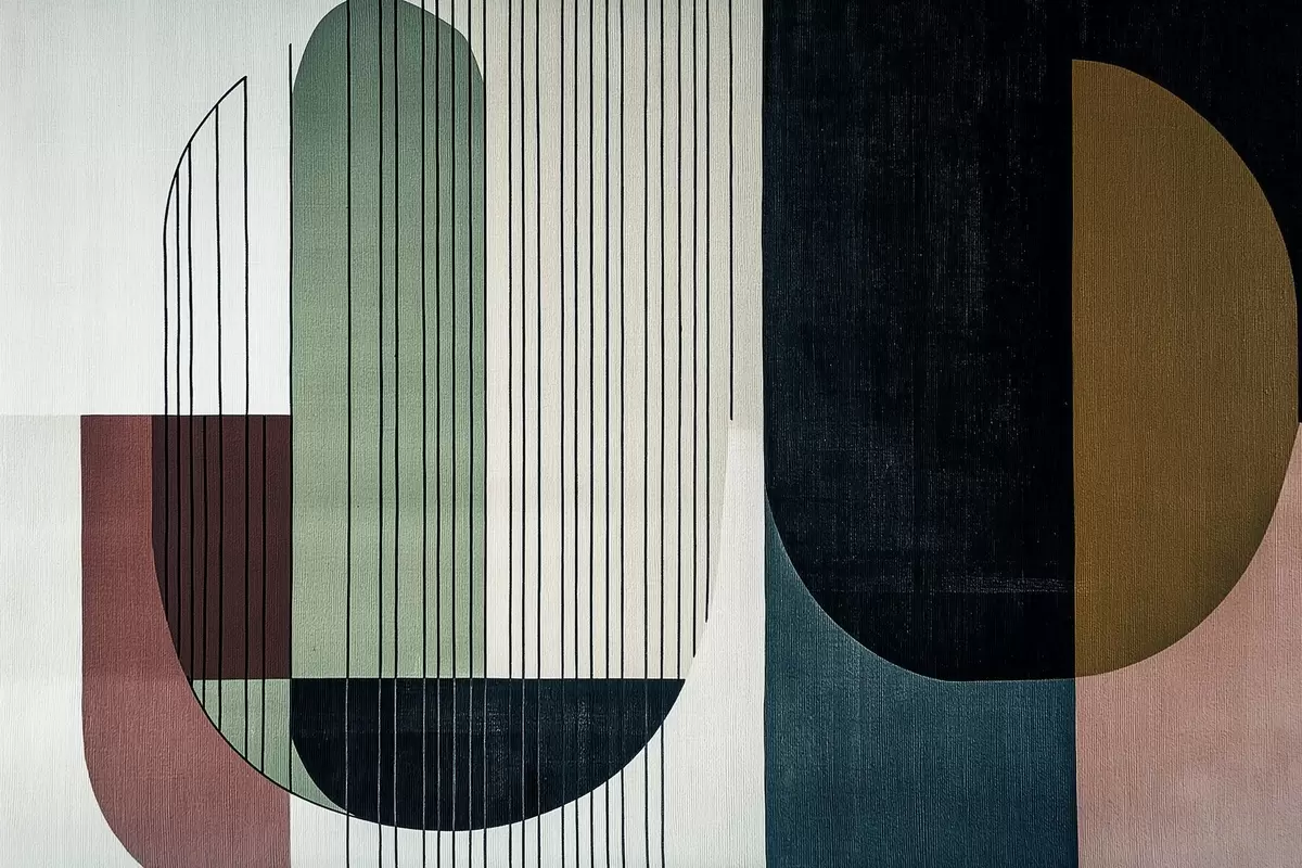 Fotomurales moderna composición geométrica abstracta con formas superpuestas y patrones de líneas verticales, finas líneas que rellenan trapecios y óvalos, suave textura textil superpuesta, tonos cálidos apagados como verde oliva, topo, beige y carbón, sutiles efectos de transparencia entre las formas Nr. w03937