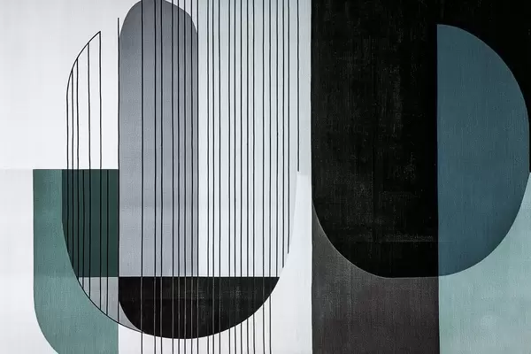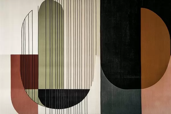 murales de pared moderna composición geométrica abstracta con formas superpuestas y patrones de líneas verticales, finas líneas que rellenan trapecios y óvalos, suave textura textil superpuesta, tonos cálidos apagados como verde oliva, topo, beige y carbón, sutiles efectos de transparencia entre las formas w03937v1
