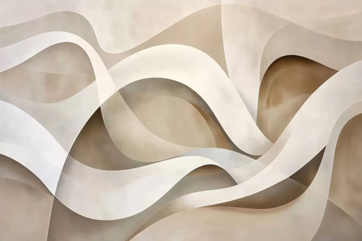 Fotomurales composición minimalista abstracta de formas orgánicas en capas, cada una perfilada con un suave borde blanco, rellena de densos trazos lineales internos, como textura de tela o papel, curvas fluidas en tonos neutros beige, arena, piedra y marfil, aspecto gofrado Nr. w03940