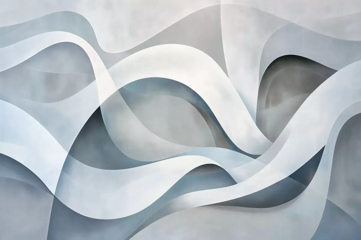 Fotomurales composición minimalista abstracta de formas orgánicas en capas, cada una perfilada con un suave borde blanco, rellena de densos trazos lineales internos, como textura de tela o papel, curvas fluidas en tonos neutros beige, arena, piedra y marfil, aspecto gofrado Nr. w03940v2