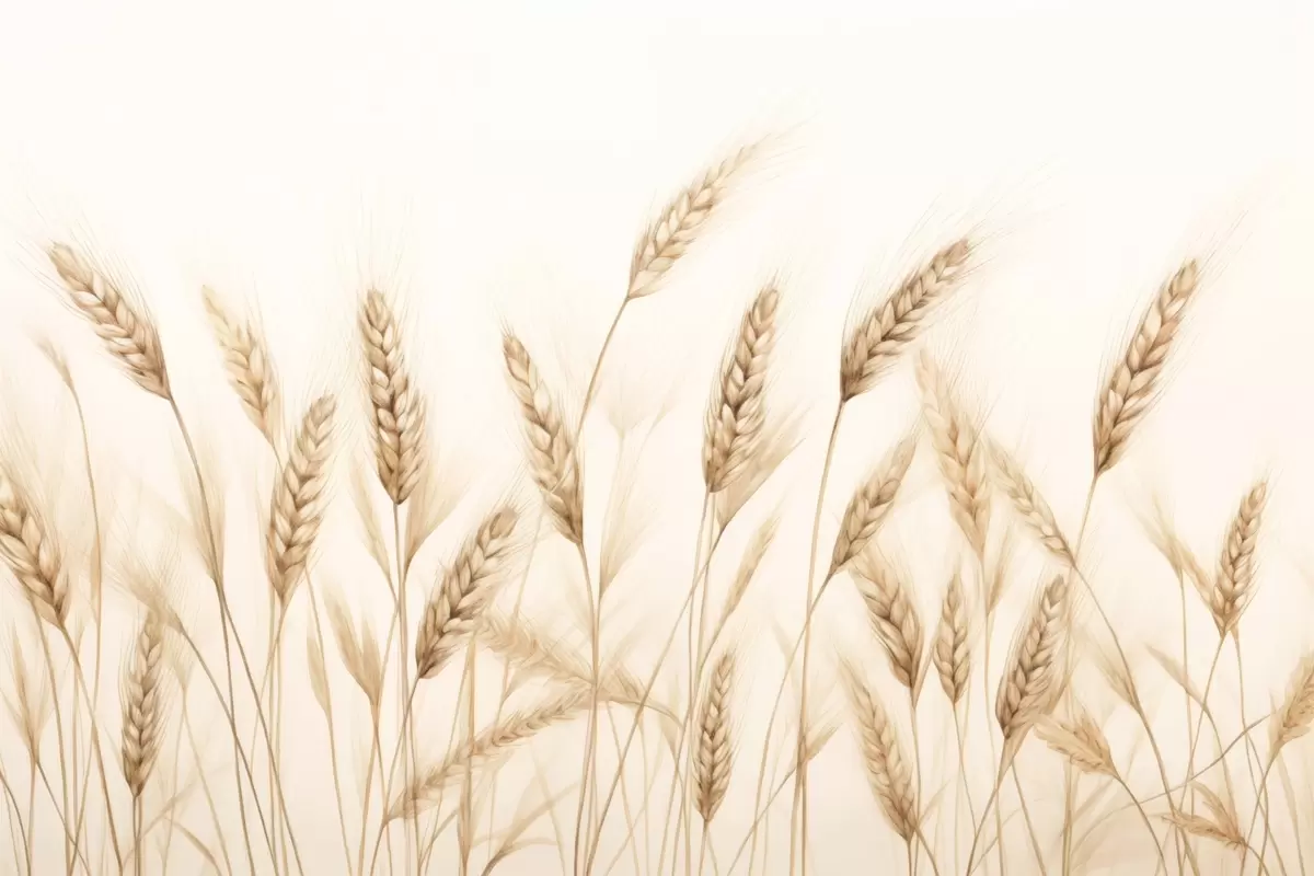 Fotomurales delicada ilustración botánica de tallos de trigo, estilo dibujado a mano, líneas finas con textura de tiza pastel, suaves tonos sepia y marrón terroso, fondo blanco, composición simétrica elegante, estética de boceto natural Nr. w03943