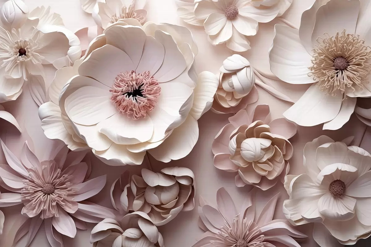 Fotomurales Composición floral volumétrica con delicados pétalos de papel o de inspiración textil en tonos marfil, vainilla y rubor, sobre un cálido lienzo beige. Nr. w03945v1