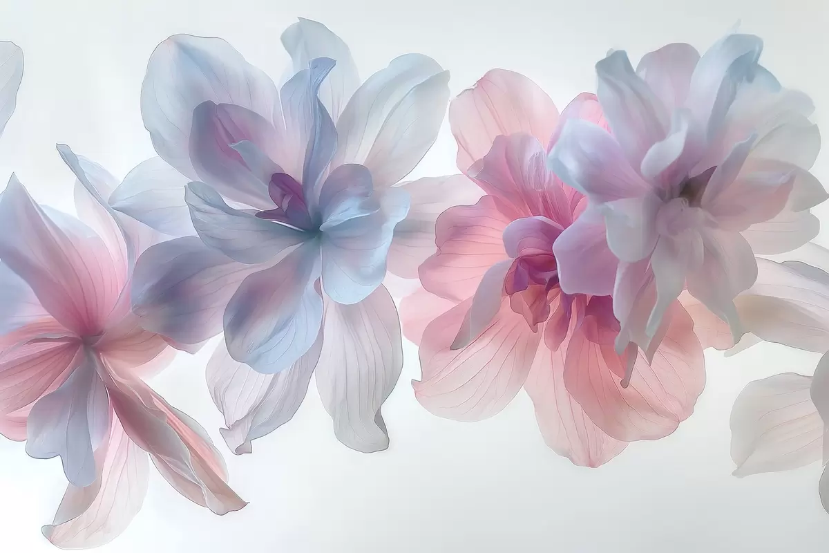 Fotomurales flores pastel hiperrealistas flotando en el espacio blanco, pétalos delicados, iluminación etérea, detalladas ilustraciones botánicas, Nr. w03946