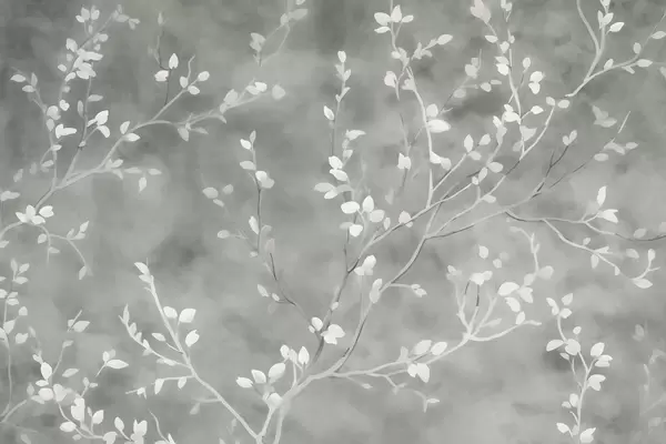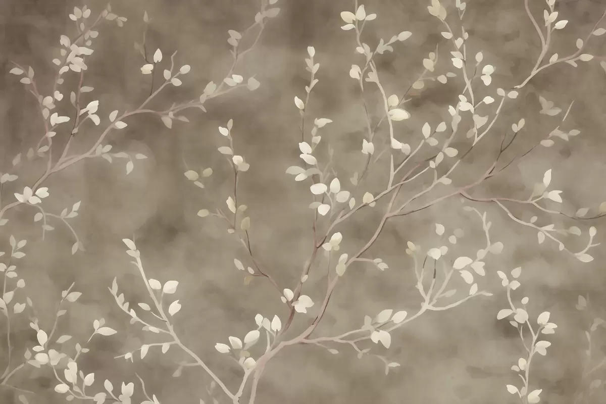 Fotomurales papel pintado minimalista pintado a mano con suaves ramas de árbol blancas con delicadas hojas, que se ramifican orgánicamente sobre un fondo verde salvia apagado, finas líneas botánicas de flujo natural Nr. w03949v1