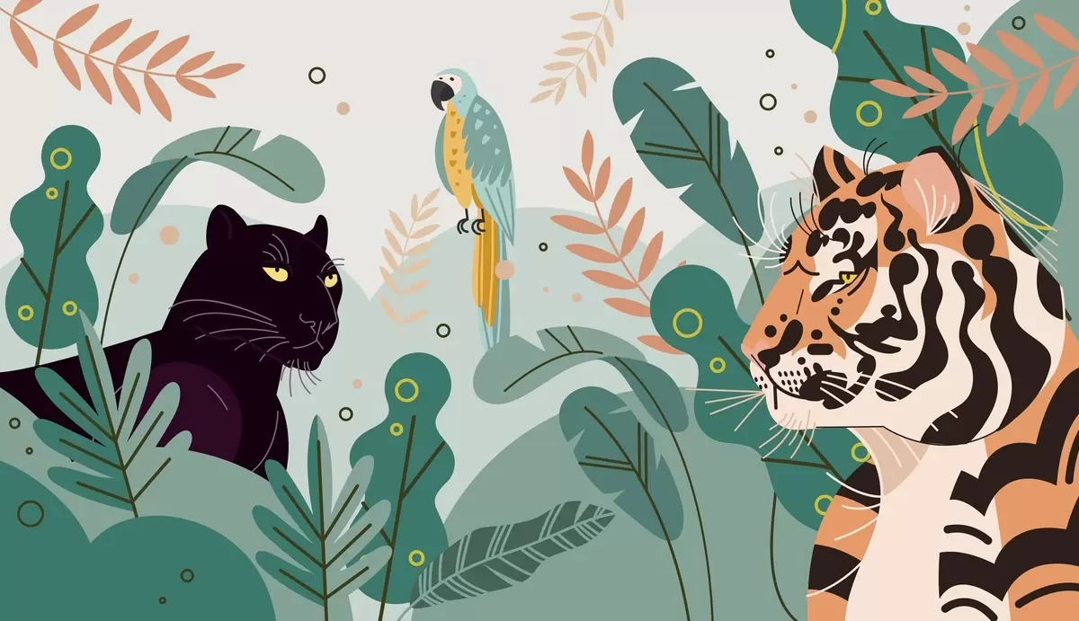 Fotomurales jungla con un tigre, una pantera y un loro Nr. w03958