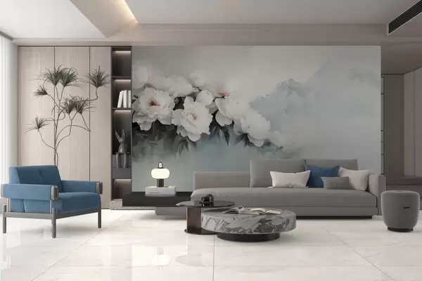 Fotomurales pintorescas y exuberantes peonías blancas con las montañas neblinosas como telón de fondo Nr. w03965