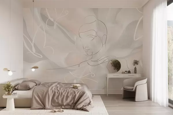 murales de pared Abstracción floral con dibujo lineal de Buda, colores beige w04004
