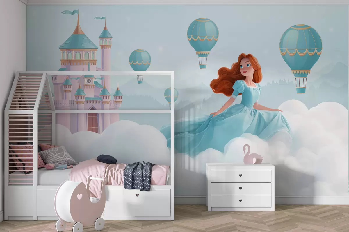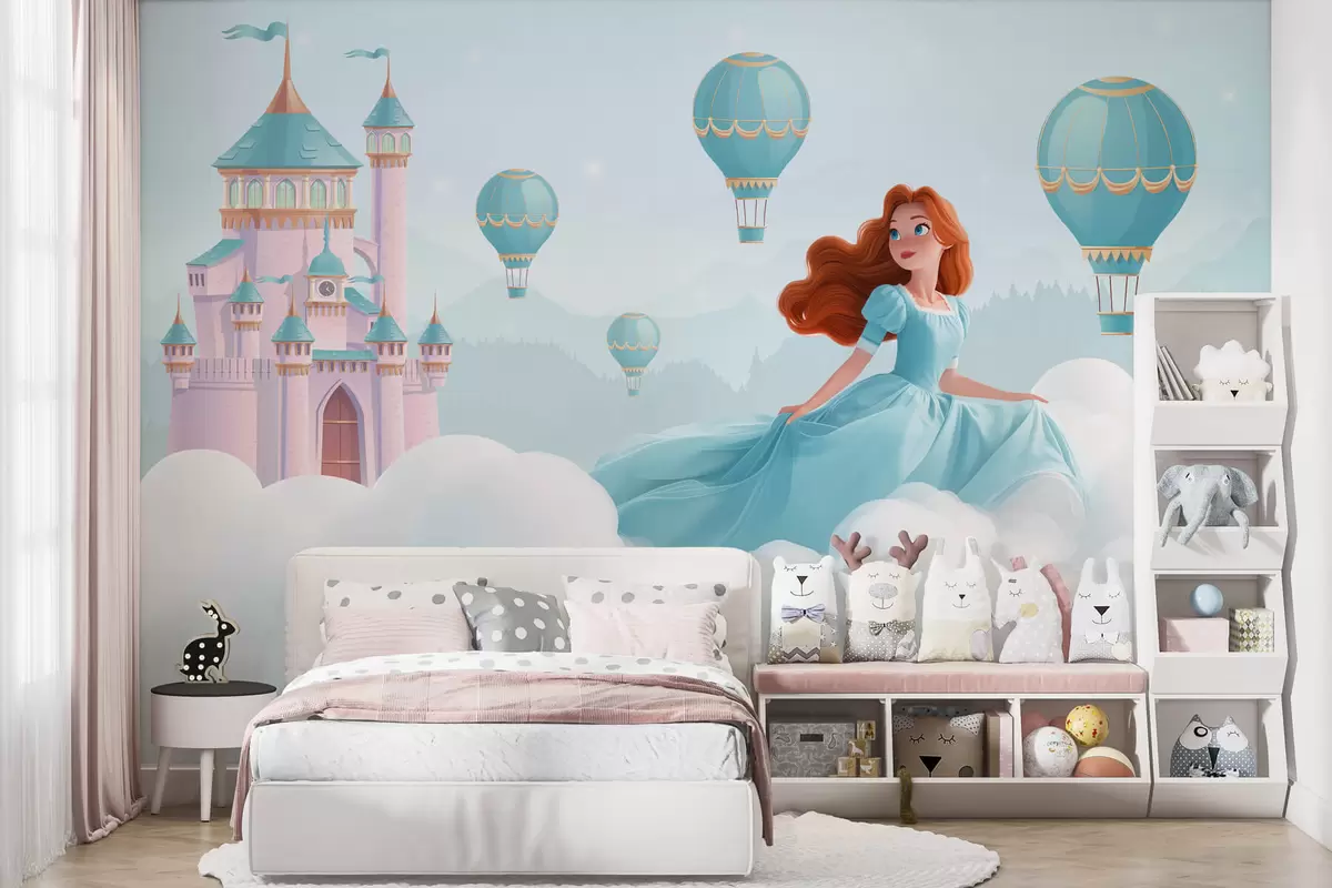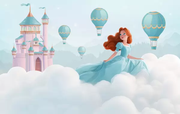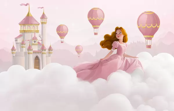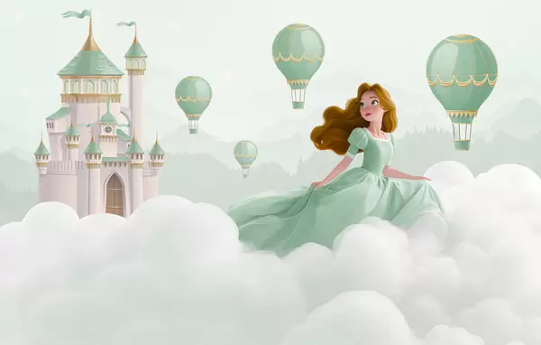 Fotomurales Princesa entre las nubes sobre el fondo del paisaje con el castillo Nr. w04015