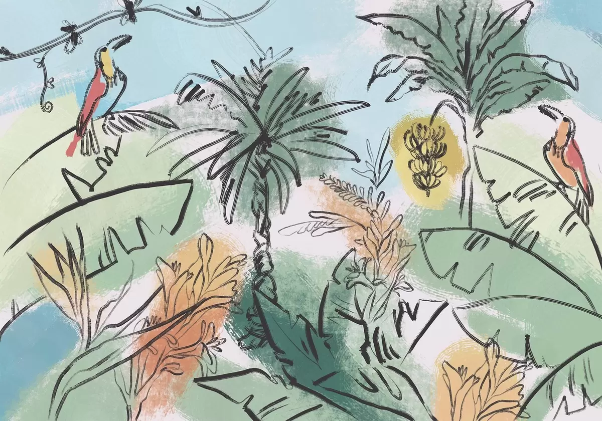Fotomurales Estampado tropical con loros, colores vivos, trópicos Nr. w04019