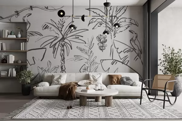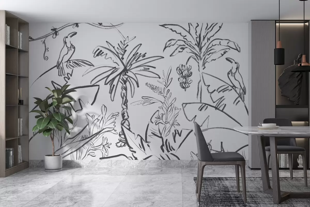Fotomurales Dibujo lineal tropical, plátanos, palmeras, gráficos de contorno Nr. w04020