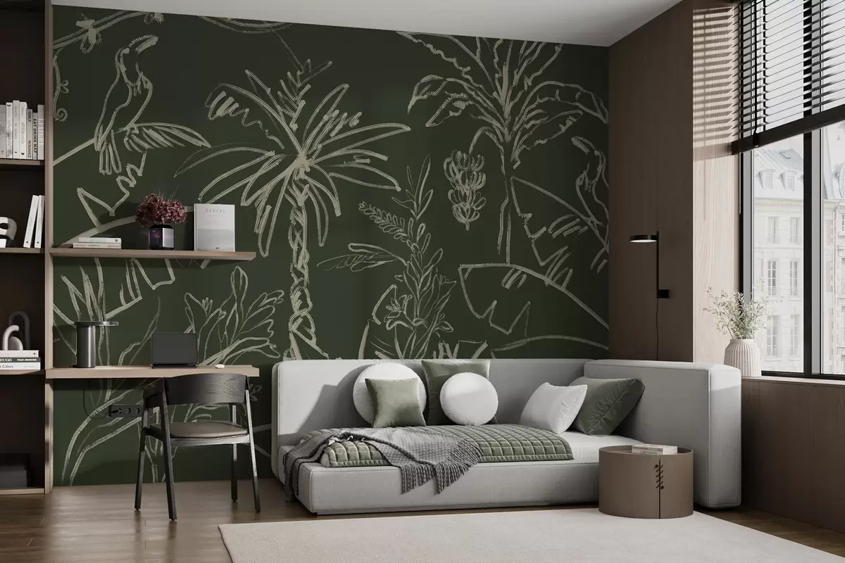 Fotomurales Patrón tropical sobre fondo verde oscuro, palmeras, plátanos Nr. w04020v5