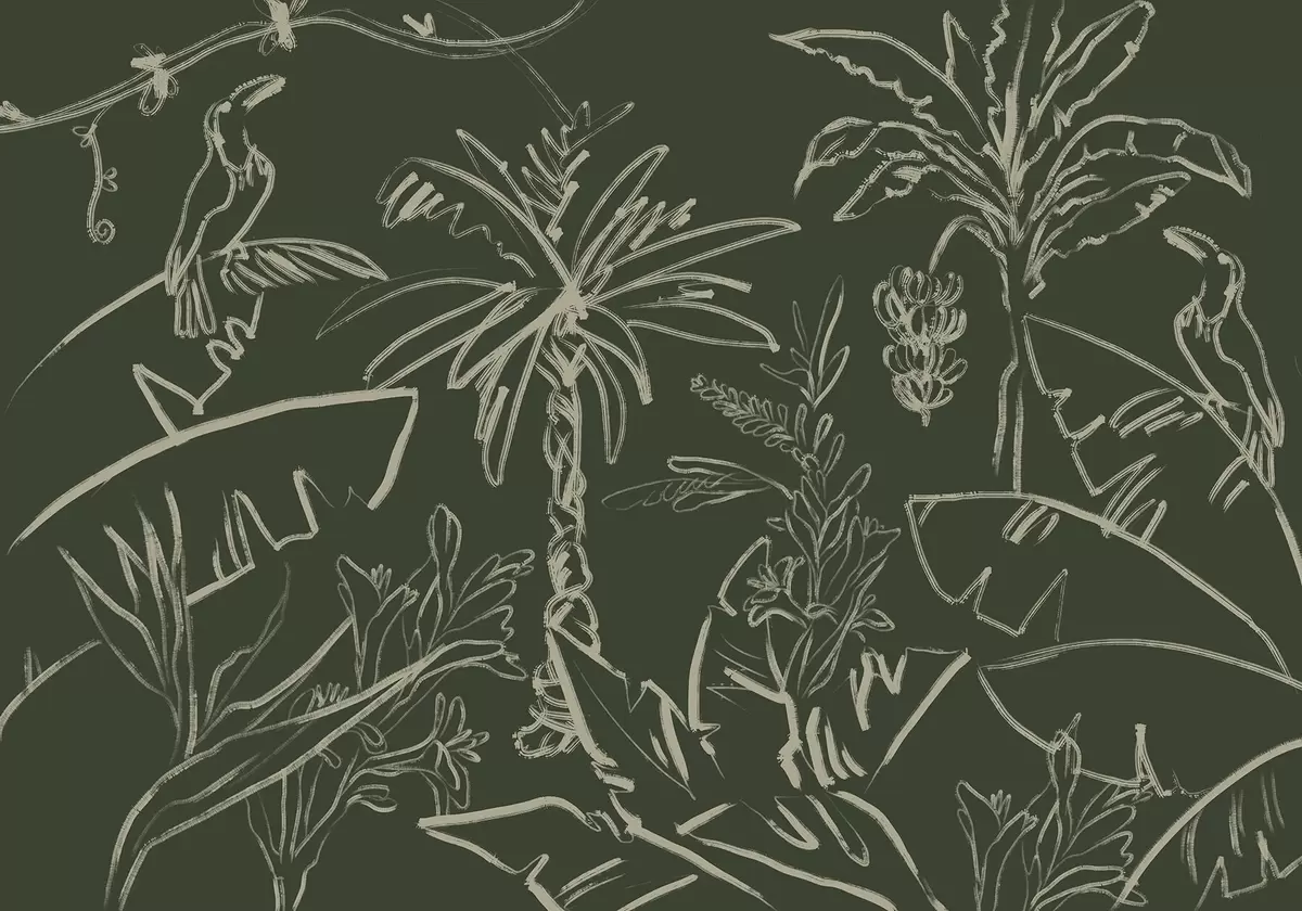 Fotomurales Patrón tropical sobre fondo verde oscuro, palmeras, plátanos Nr. w04020v5