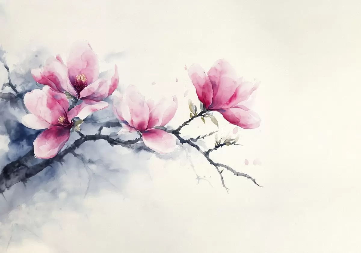 Fotomurales rama floreciente de magnolia rosa sobre fondo marfil Nr. w04027