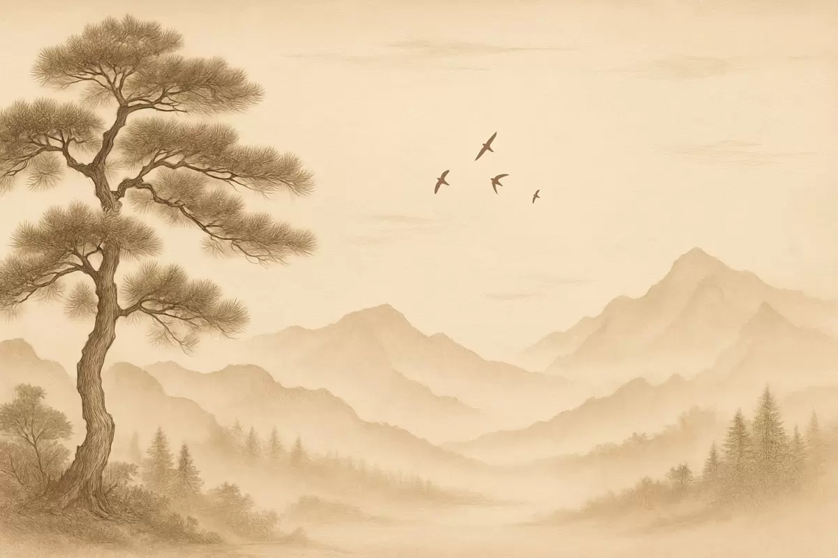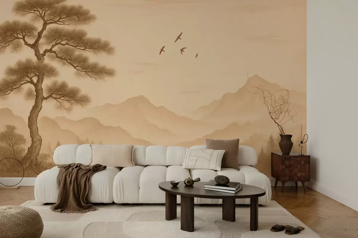 Fotomurales panorama de las colinas con un gran árbol en estilo sepia Nr. w04033