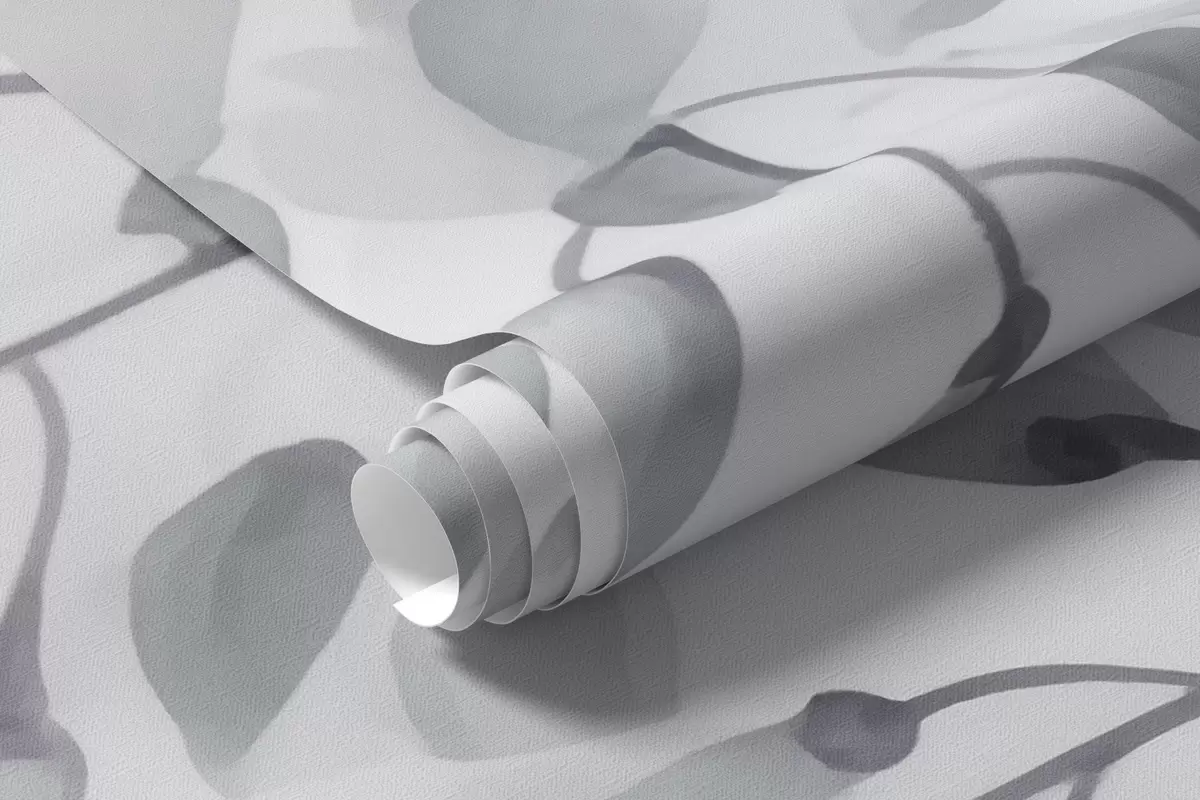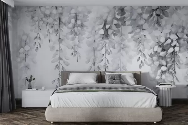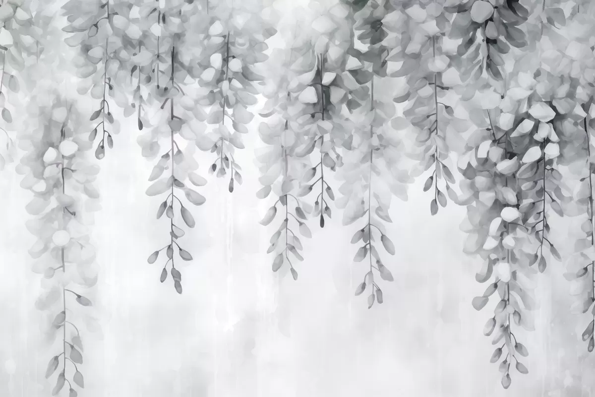 Fotomurales Acuarela monocroma con glicinas en cascada en tonos plateados y blancos fríos, que evocan la quietud y la suavidad invernal Nr. w04034v1